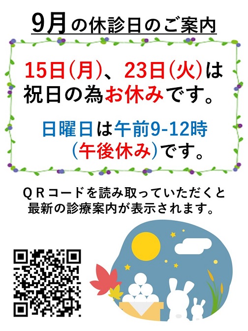 9月は祝日が2回もありますので、ご来院の際はお気をつけください。m(_ _)m